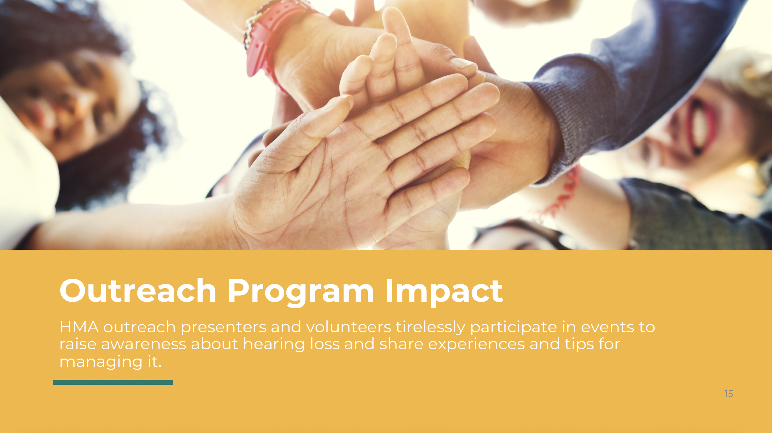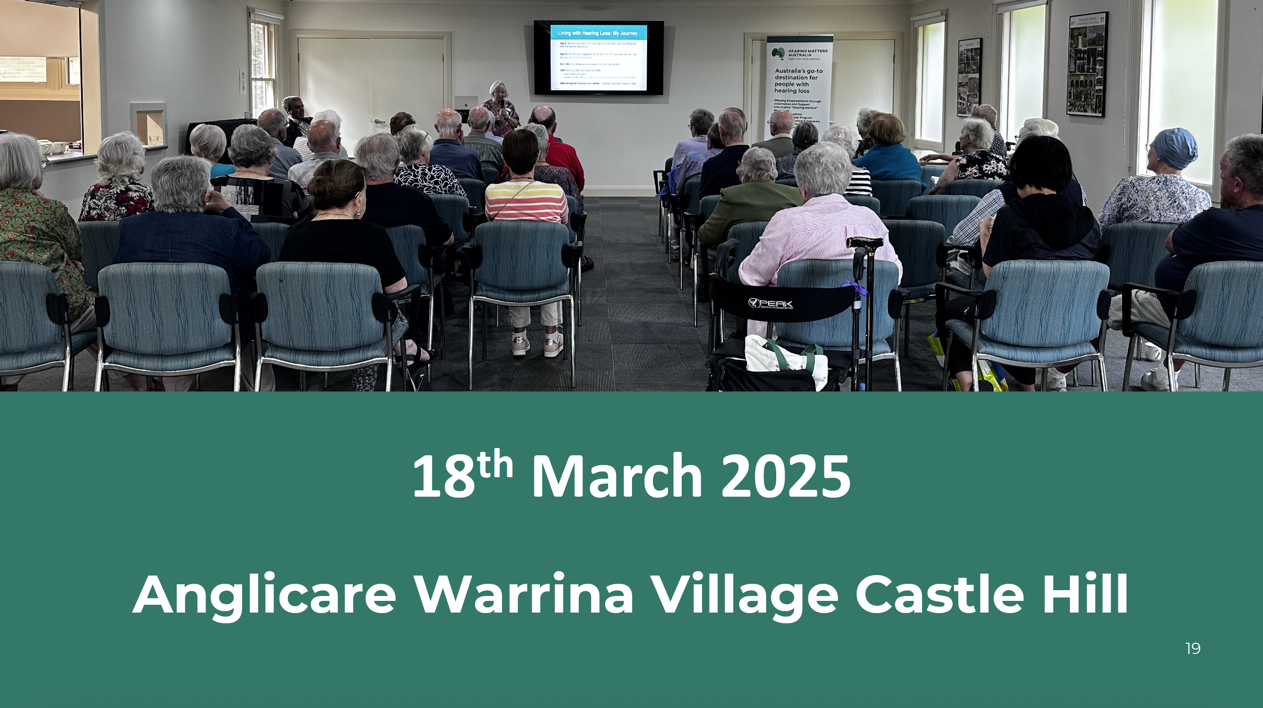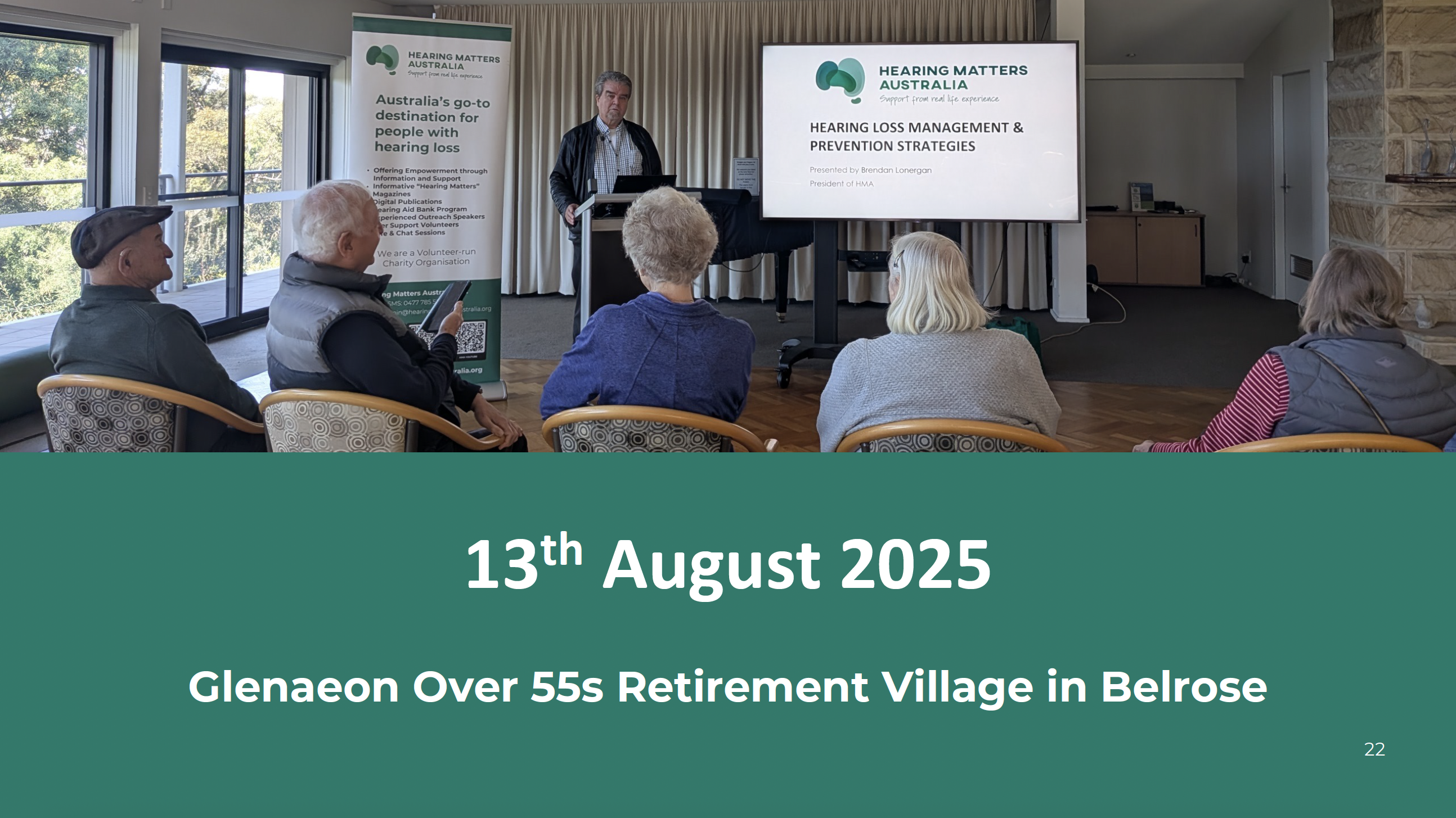 Our Outreach program is available for groups to book a speaker to talk about Hearing Loss, hearing help strategies, communication and other related topics.